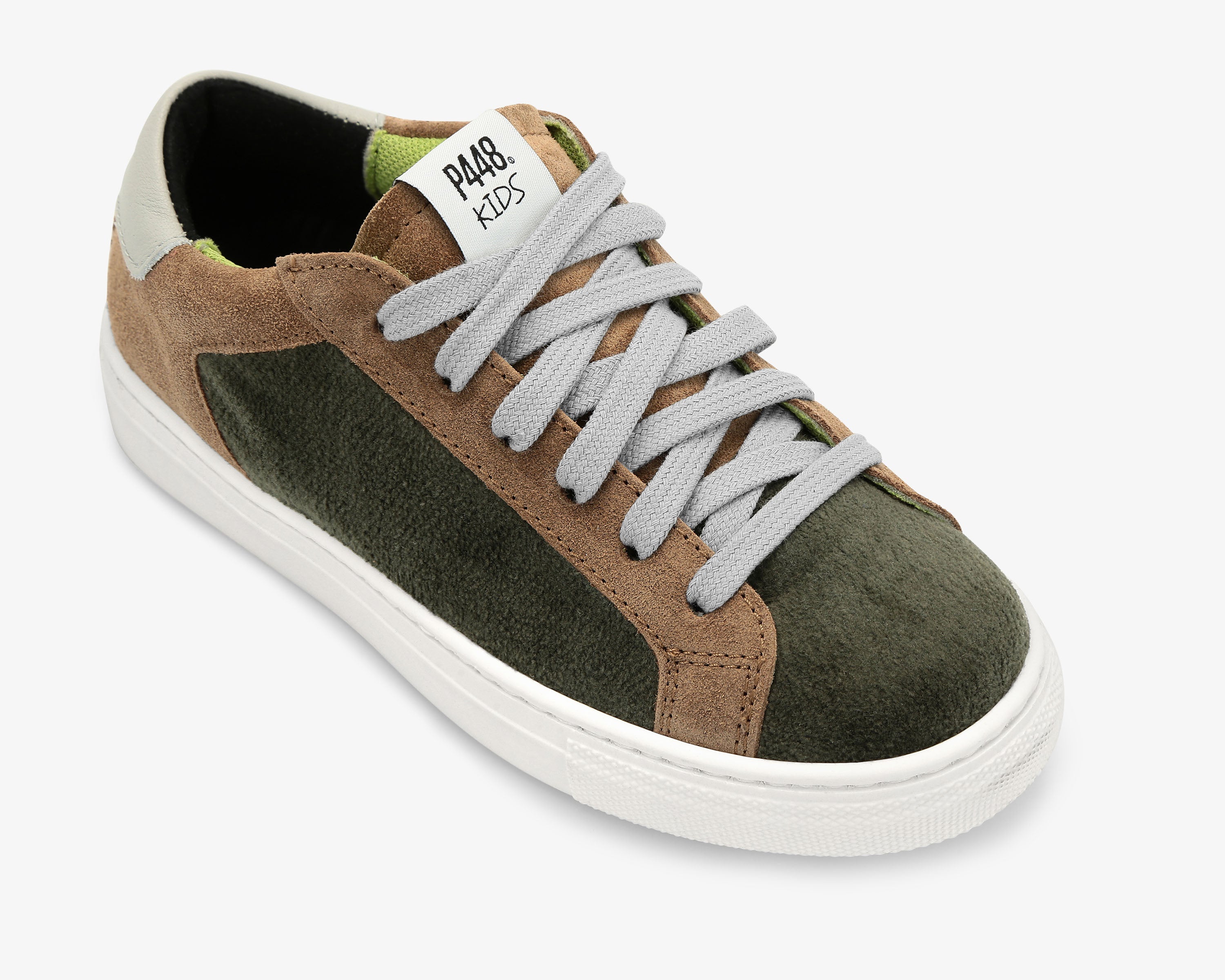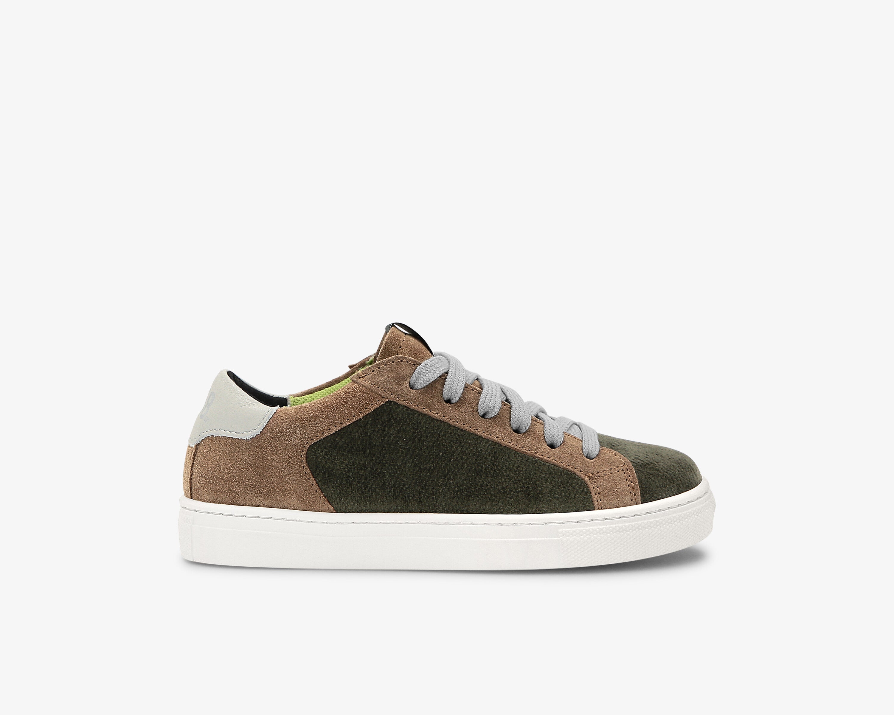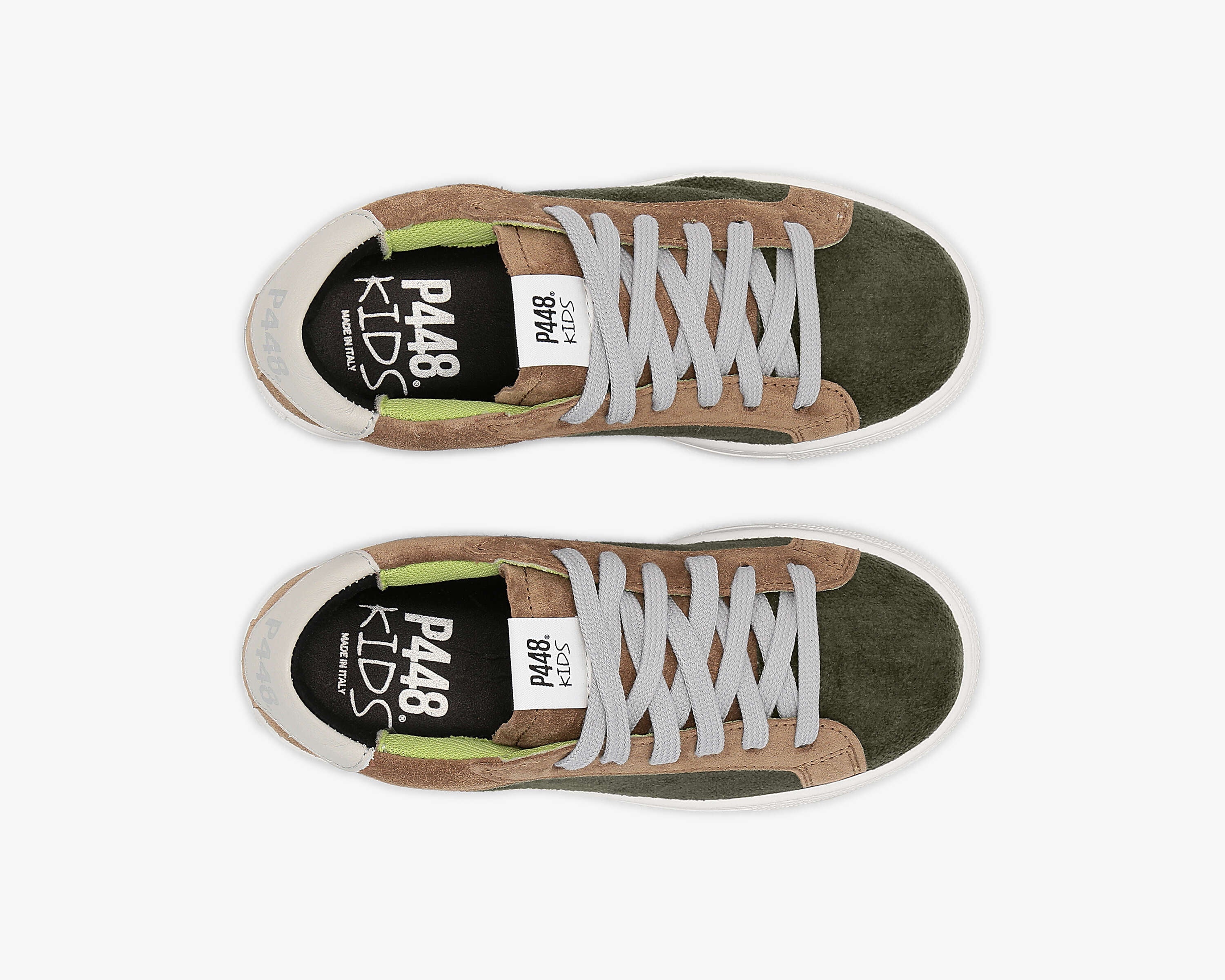 Meet the John Jr. Jungle, a miniaturized take on our fan-favorite low-top in a neutral colorway with a khaki green distressed velvet upper and tongue, saddle-brown suede trim & toe, and a light grey leather heel tab. Finished with grey cotton laces and fluorescent yellow mesh accents.