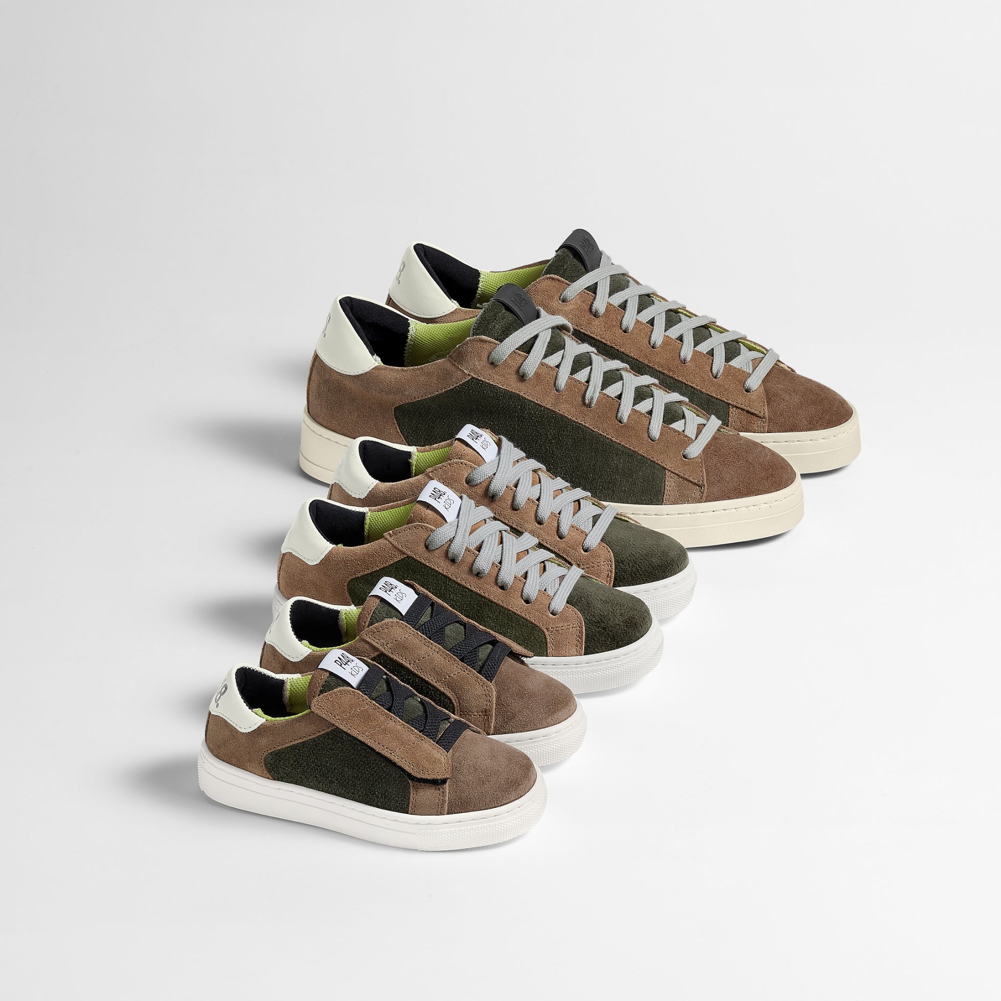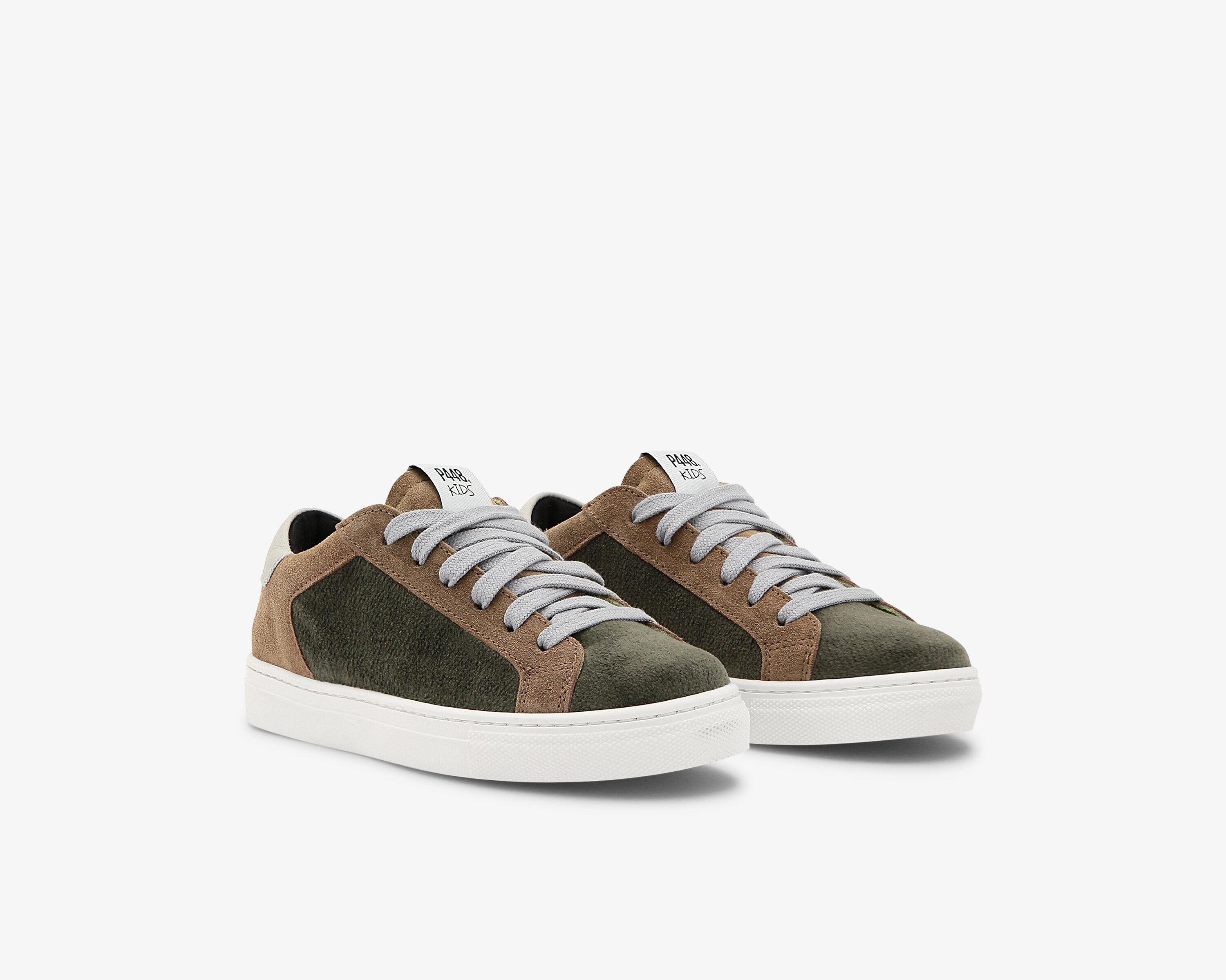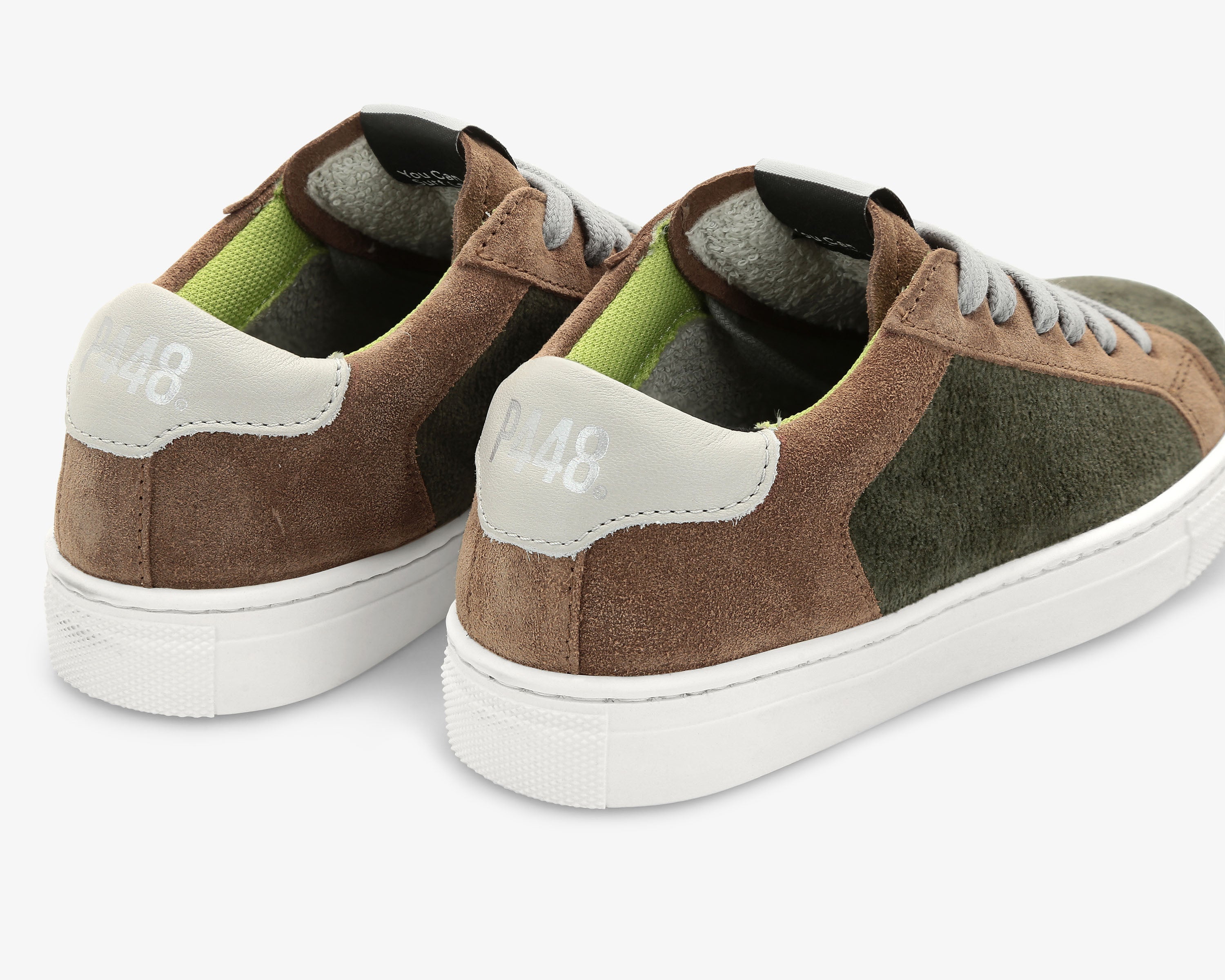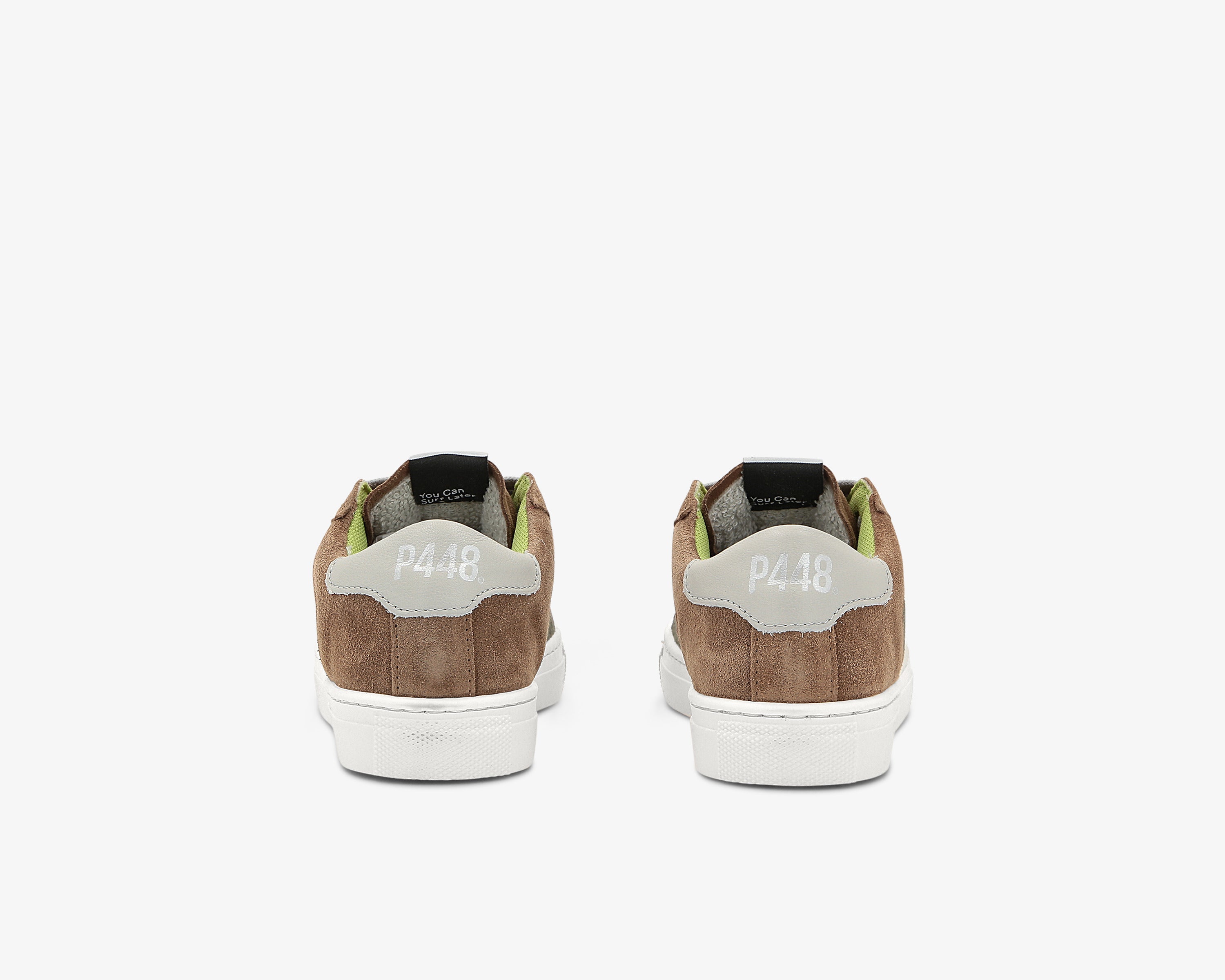 Meet the John Jr. Jungle, a miniaturized take on our fan-favorite low-top in a neutral colorway with a khaki green distressed velvet upper and tongue, saddle-brown suede trim & toe, and a light grey leather heel tab. Finished with grey cotton laces and fluorescent yellow mesh accents.